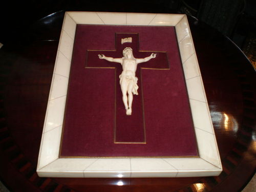CRISTO EN MARFIL, MEDIDAS LARGO 18 CM, ANCHO 14 CM. SOBRE CRUZ DE MADERA LARGO 36 CM. ANCHO 22 CM. DICE INRI SOBRE MARFIL.